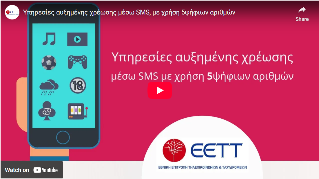 Η πρόσβαση σε υπηρεσίες αυξημένης χρέωσης είναι εξορισμού ενεργοποιημένη στα κινητά τηλέφωνα. Eνημερωθείτε από τον πάροχο κινητής τηλεφωνίας για τη δυνατότητα φραγής χρεώσιμων εισερχόμενων μηνυμάτων SMS από 5ψήφιους αριθμούς. Επίσης, μπορείτε να ενεργοποιήσετε τη φραγή μέσω των εφαρμογών που διαθέτουν οι πάροχοι. | ||